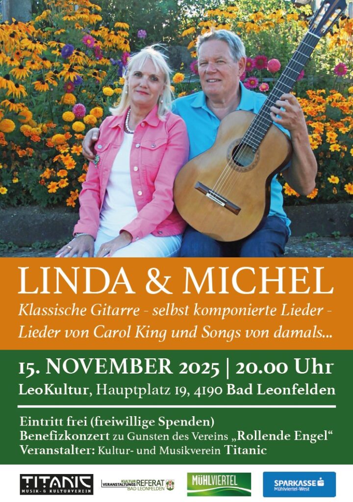 Michel van de Lindt, der seine musikalische Ausbildung in Holland absolvierte und später als Gitarrenlehrer in Österreich arbeitete, wird den Abend mit seinen Darbietungen auf der klassischen Gitarre eröffnen. Seine Frau Linda, die als Lehrerin an der Hauptschule in Bad Leonfelden tätig war, wird anschließend ihre selbstgeschriebenen Lieder präsentieren, die sie in ihrer Jugend komponiert hat und von Themen wie Schule, Liebe und Freundschaft erzählen. Den Abschluss bildet ein gemeinsamer Teil mit bekannten Liedern von Carol King und anderen Künstlern.
